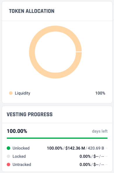 NEIROの総供給量は 420.69億 NEIRO に固定されている。トークン配分はシンプルで、100%が「Liquidity(流動性)」に割り当てられており、開発チームや財団向けの割当は存在しない。特別なリザーブやトランザクション税も設けられておらず、すべてがコミュニティに開かれている。