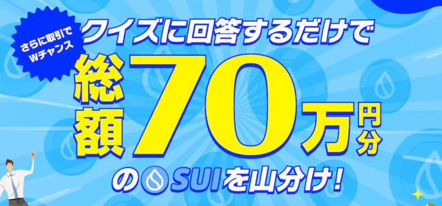 ① クイズ回答者全員にSUIをプレゼント キャンペーン期間内にクイズに回答した全員で、総額40万円分のSUIを山分け(正解不問) ② 取引でWチャンス! キャンペーン期間内に【販売所】でSUIを5,000円以上購入した方の中から、抽選で30名様に1万円分のSUIをプレゼント! |