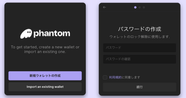Phantomを立ち上げると、表示された画面で「新規ウォレットを作成」を選択します。指示に従ってパスワードを入力して「続行」をクリックします。