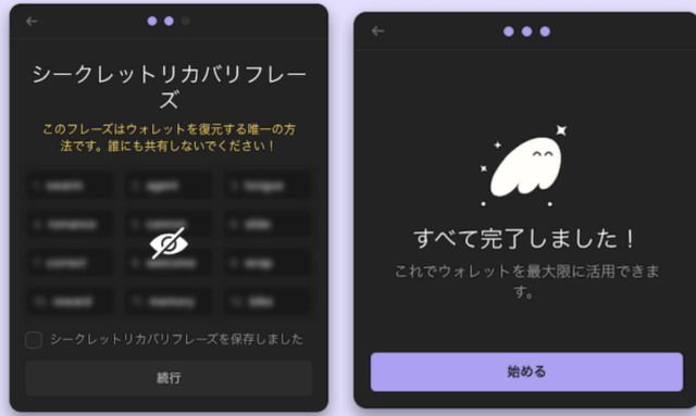 ステップ3: ウォレットにより生成されるシークレットリカバリーフレーズを記録し、安全な場所に保管してください。