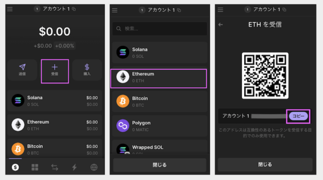 Phantom Walletを開き、「受信」を選択。次に、受信するトークンを選択し(例ではETHを選択)、表示されたアドレスをコピーします。
