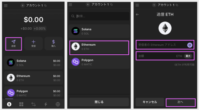 送信を選択し、送信するトークンを選択(今回はEthereumを選択)。次に、SBIVCトレードからコピーしたアドレスを貼り付け、転送するトークンの量を入力して「次へ」をクリック