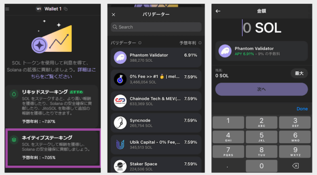 バリデーターの手数料と、年利回り(APY)を確認します。出典:Phantom