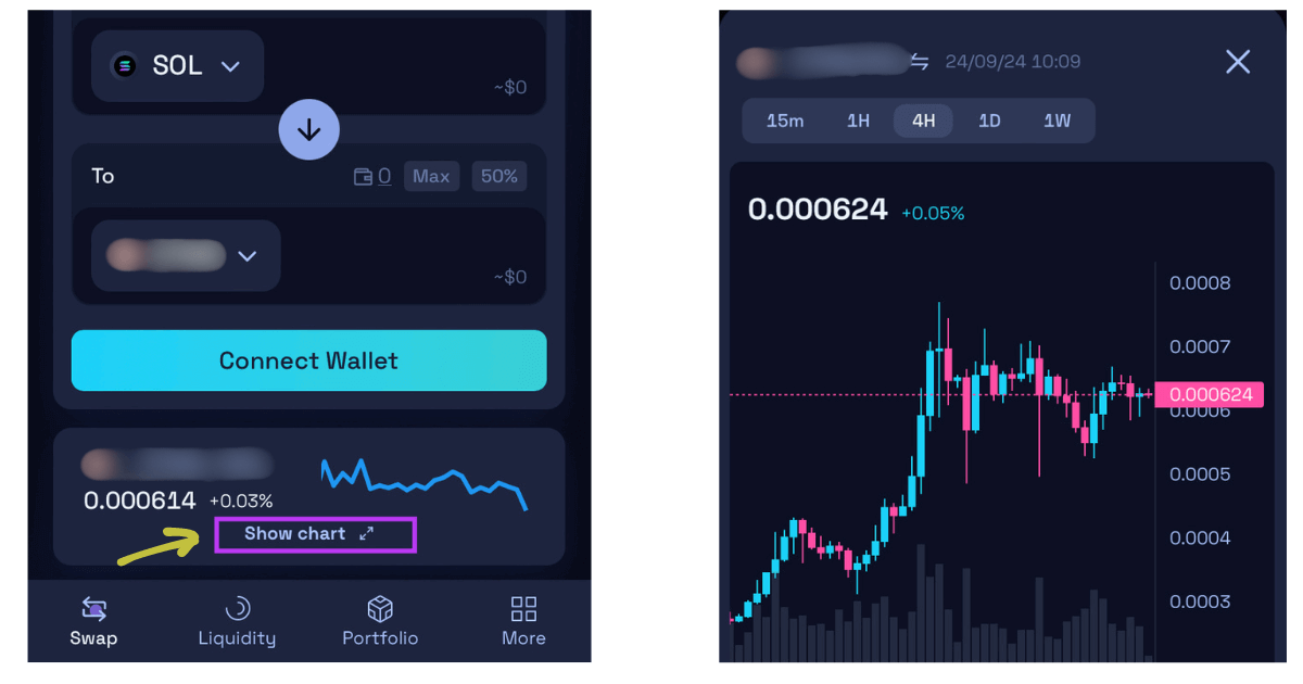 「Show Chart」をタップすると、SOL建のチャートを確認できます。出典:Raydium