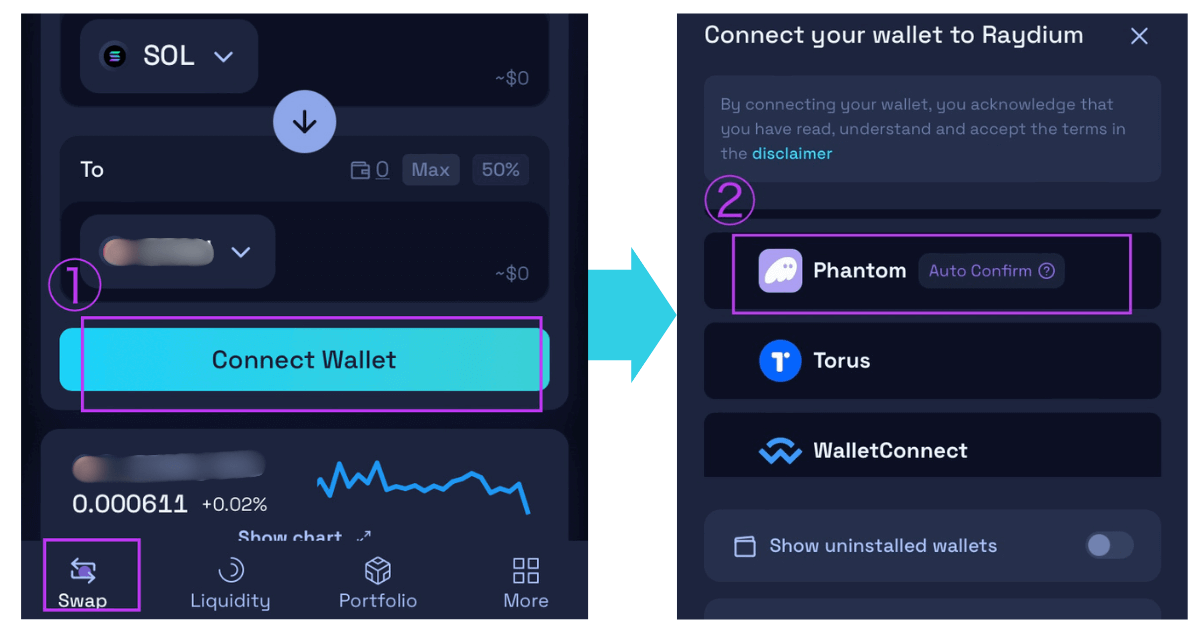 ①Raydiumの公式サイトにアクセスし、「SWAP」画面で「Connect Wallet」をタップ。