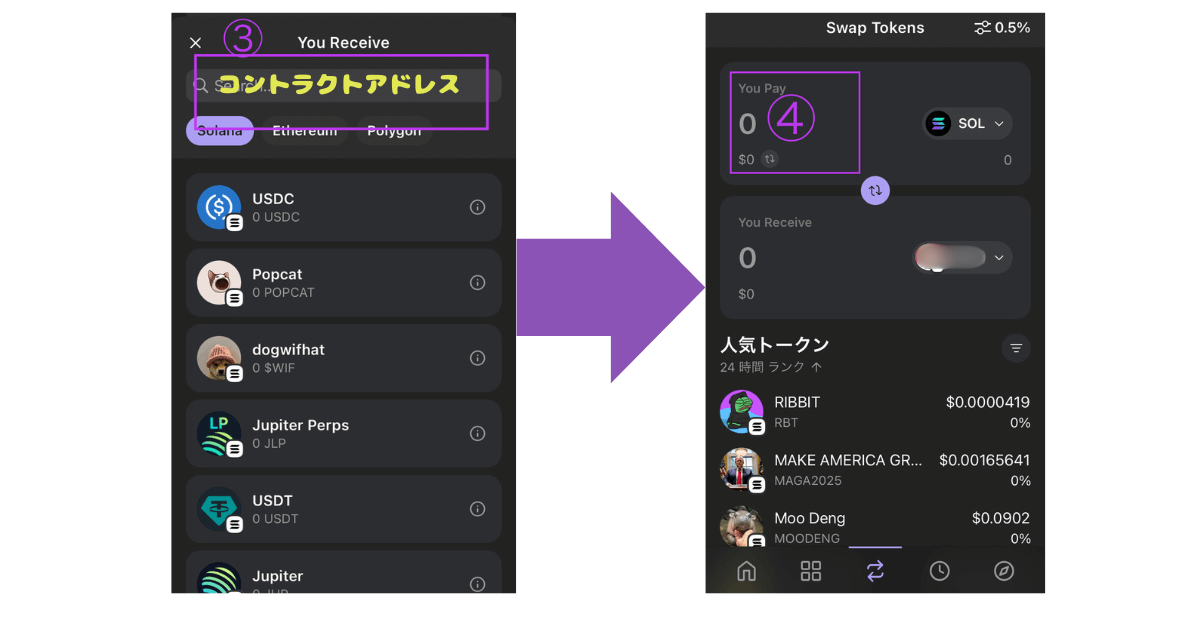③購入したいトークンのコントラクトアドレスをペーストして選択します。