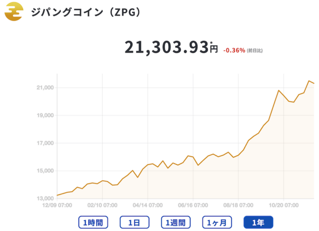 金は伝統的に「安全資産」として認識され、特にインフレや地政学的リスクに強い資産として知られています。ジパングコイン(ZPG)の価格推移を見ると、ZPGの価格は過去1年で約55%上昇し、2025年12月現在、21,303円に達しています。