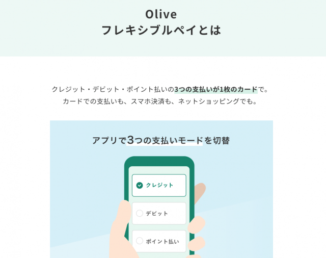 公式サイトによると、Oliveフレキシブルペイは、Visaが開発した複数の支払い方法を集約・決済モードを選択する機能を世界で初めて使用した画期的なサービスです。※