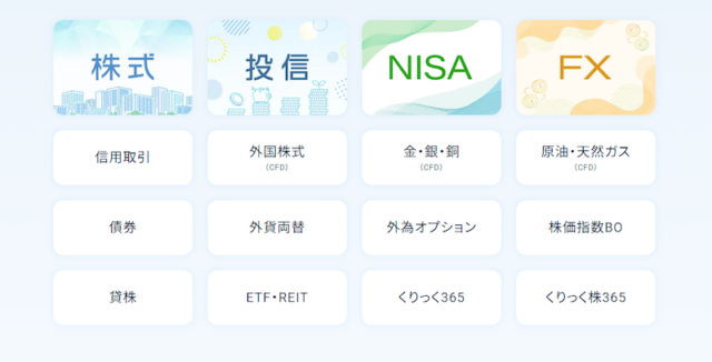 GMOクリック証券の取扱商品は多岐にわたりますが、株初心者が押さえておきたいのは、国内株式(現物・信用)、米国株関連(CFD)、投資信託、そしてNISA制度への対応状況です。それぞれのサービスの特徴について解説します。