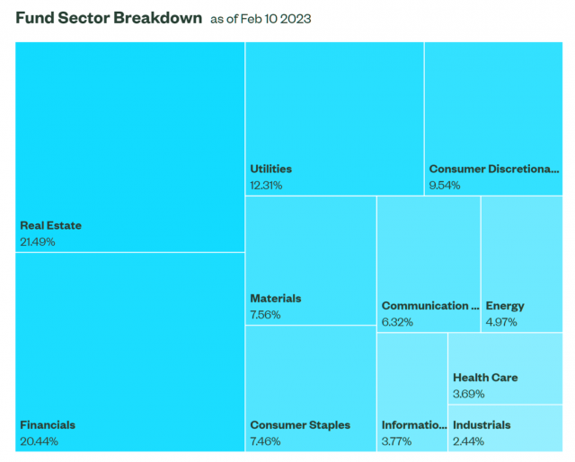 以下に一例として、S&P500高配当指数に連動し、利回りが高いことで知られるETF「SPYD」の構成比率を表したものです。投資先の業界が分散されていることが分かります。