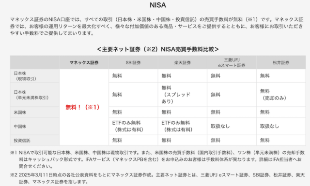 新NISAの売買手数料が実質無料となる点は、主要ネット証券と同水準です。