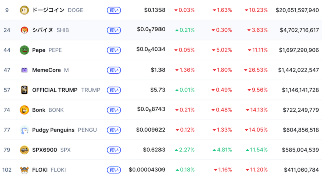 ミームコイン分野TOP銘柄 出典:コインマーケットキャップ(2025年12月時点)