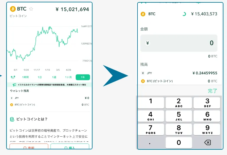 購入画面で金額を入力し、「ビットコイン購入」ボタンをタップすれば、取引が即時に完了します。