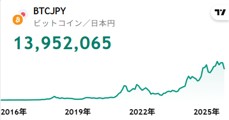 BTC/円 長期チャート(bitFlyer) 出典:TradingView- 現在価格:約1,400万円