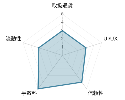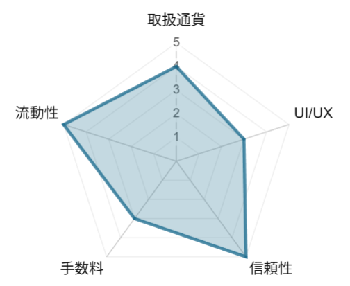 本項では、実績や評判に基づいた国内暗号資産(仮想通貨)取引所のレーダーチャートを紹介します。評価基準は、1.取扱い通貨数、2.使いやすさ、3.信頼性、4.手数料、5.流動性で、それぞれ5点満点です。