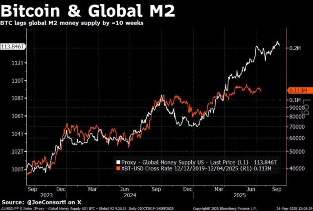 ブルームバーグビット社は9月1日、米M2マネーサプライが22兆1,200億ドルに達したと報告した。投資会社テフラ・デジタルは、ビットコインのM2および金との遅行相関が維持されれば年内に16万7,000ドルから18万5,000ドルの価格帯に達する可能性があると予測。2025年の世界M2供給量は1月以降7兆ドル追加され総額112兆ドルに到達した。