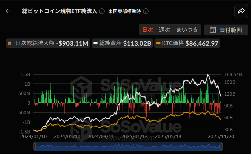 11月20日(米東部時間)、米国ビットコイン現物ETF(上場投資信託)市場は合計9億300万ドル(約1,395億円)の純流出を記録し、史上2番目の規模となった(データ元:SoSovalue)。