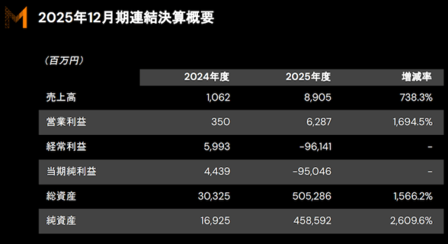 暗号資産(仮想通貨)ビットコイン(BTC)の財務企業メタプラネットは16日、2025年12月期の通期決算を発表した。