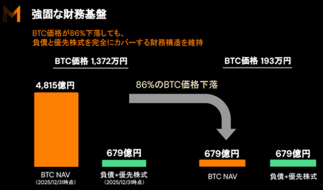 他にも同社は、資本構造や資本調達額などに触れながら、財務基盤が強固であることも説明した。たとえビットコインの価格が1,372万円から193万円に86%下落したとしても、負債と優先株式を完全にカバーする財務構造を維持していると述べている。