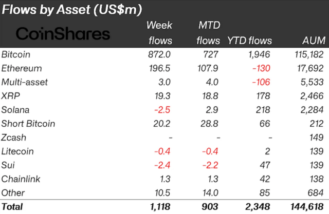 コインシェアーズは、仮想通貨投資商品全体の先週における資金フローは約357億円の純流入だったと報告。銘柄別ではXRPの投資商品に最も多くの資金が流入し、ビットコインが続いた。