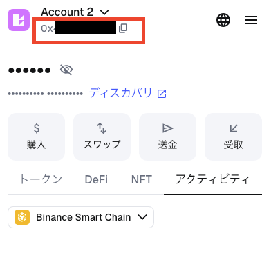 ①メタマスクを開き、ネットワークがBNB Smart Chain(BEP20)になっているか確認。