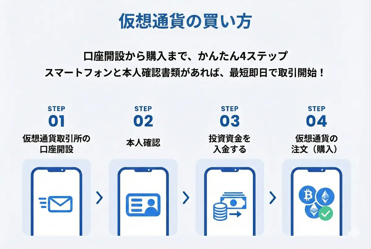以下の4ステップで、初心者の方でも簡単にイーサリアムの購入が可能です。