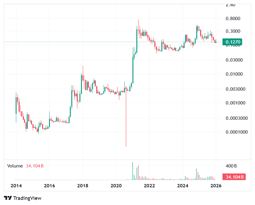 2026年1月時点 出典:コインマーケットキャップ - 過去最高値:0.68ドル(約79.44円)(21年5月)