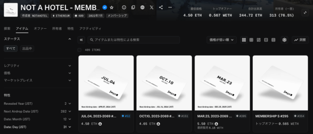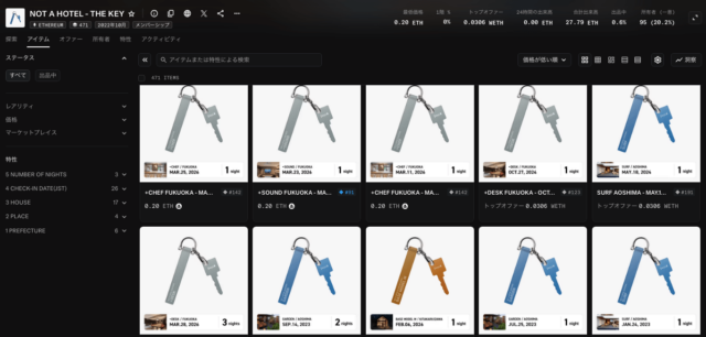メンバーシップNFTの保有者が、毎年届く宿泊権「THE KEY」をOpenSeaなどの二次流通市場で自由に売却することもでき、その価格は1泊あたり約0.2ETH(約74,000円)~(※2026年2月1日現在のOpenSeaフロア価格)が目安となっています。