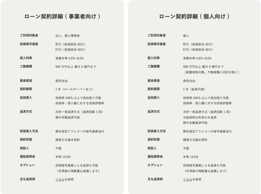 - 「デジタルアセット担保ローン」:暗号資産を担保に、日本円を資金調達できるサービス。(借入には審査がございます。)