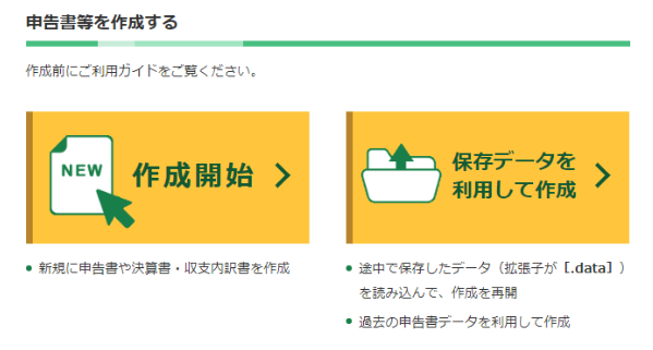 まず「確定申告書等作成コーナー」へアクセスし、「申告書等を作成する」の項目内にある、「作成開始」をクリックします。