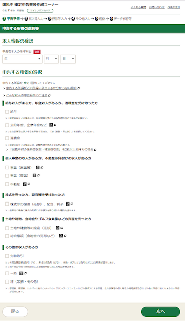 先ほどの「申告する所得の選択等」で選んだものが入力項目として表示されます。