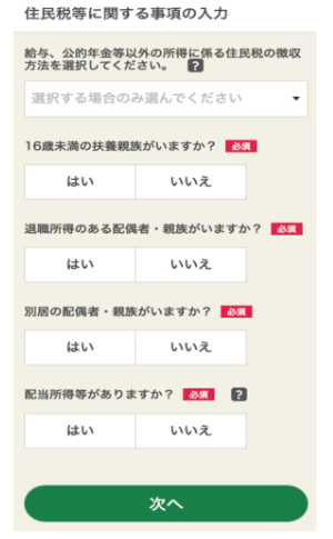 続いて、住民税等に関する質問事項が表示されるので、回答していきましょう。回答が終わったら「次へ」をタップします。