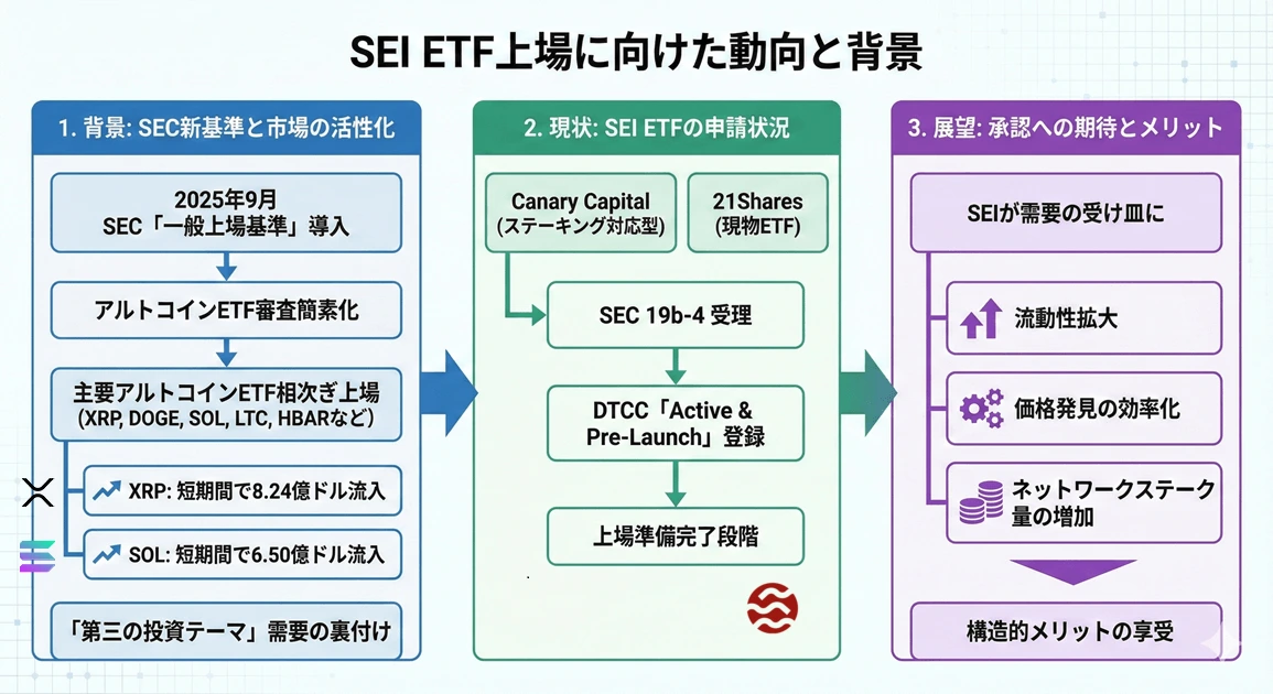 SEI のETF申請は Canary Capital(ステーキング対応型) と 21Shares(現物ETF) が主導。Canaryの商品はすでに SEC の19b-4 受理、DTCC「Active & Pre-Launch」登録まで進んでおり、技術的には上場準備が整った段階に入っている。