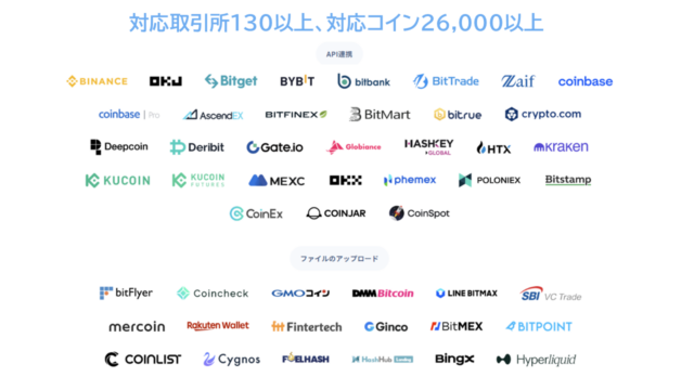 また、現在の対応取引所は130箇所以上、対応通貨は26,000種類以上となっており、幅広いニーズに応えるものとなっています。(対応取引所以外でもデータの手動入力により計算可能)