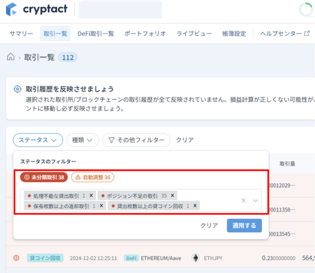 未分類取引とは、アップロードされた全てのファイルを集計する過程で、cryptactが処理出来なかった取引のことです。