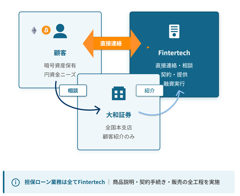 今回の取り組みでは、大和証券が「暗号資産を保有し円資金ニーズがある顧客」をFintertechに紹介し、Fintertechが直接顧客と連絡を取り、相談に応じる。