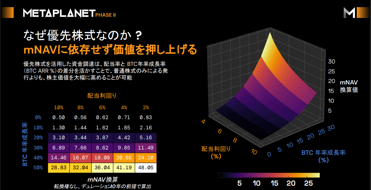 同社が優先株式を選んだ理由は、普通株式の希薄化を避けながら資金調達できる点にある。普通株式を新規発行すると、mNAV(1株当たりビットコイン保有量)が低下してしまうが、優先株式ならこれを維持できる。