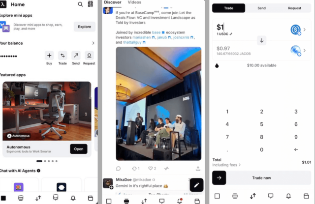 資産管理や取引に加え、ゲームや予測市場、ツール系アプリをインストール不要で利用できるminiApp機能を搭載。さらに、AIを活用したゲーム制作「リミックス」や、SNS機能を持つ分散型ネットワーク「Farcaster」との統合も進んでいます。