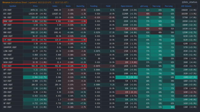 暗号資産市場全体では、日本企業が運営するマイニングプールにおいてハッキングによる流出事件が発生したことが波紋を広げている。その影響により、PoW(プルーフ・オブ・ワーク)形式の通貨群が変調をきたしている。特にドージコイン(DOGE)、ライトコイン(LTC)、ビットコインキャッシュ(BCH)などでは、先物価格が現物価格を際立って下回る状況が確認されており、これら通貨の需給は急激に引き締まりを見せている。