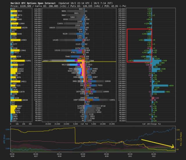 オプション市場では、コールポジションの急増によってプット・コールレシオ(PCR)が大幅に低下しており(下図赤枠・黄矢印)、投資家の態度は急速に強気へと転換している。13万ドルおよび14万ドルの権利行使価格の建玉も増加していることから(下画像赤枠)、市場参加者の多くがさらなる上昇を見込んでいることがうかがえる。