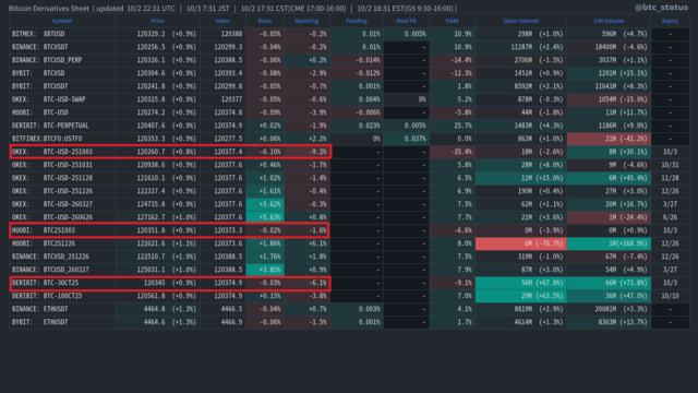 デリバティブ市場においては、先物価格が現物価格を下回る「バックワーデーション」の状態が1日以降、顕著に継続している(下画像赤枠)。この現象は、現物のビットコインに対する需要が急速に高まり、市場全体で需給が逼迫していることを示唆するものである。