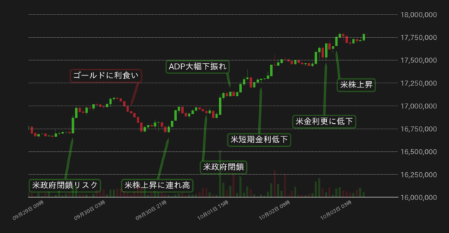 10月1日には、実際に米政府機関の一部閉鎖が決定し、無国籍資産のBTCへの資金流入が始まった。この日はADP雇用統計も大幅下振れとなり、利下げ期待が復活したこともBTC相場の支援材料となった。