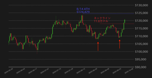 チャートの側面では、ドル建てのBTC相場はダブルボトムのネックラインとなる11万8000ドルの上抜けに成功しており、上昇トレンド突入が示唆されており、史上最高値(ATH)の12万4429ドルがターゲットとなりそうだ(第2図)。