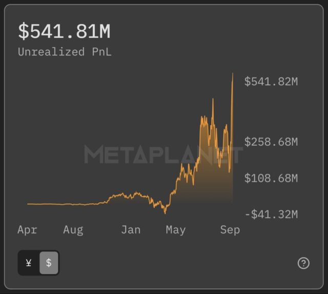 10月7日の報道によると、世界第4位のビットコイン保有企業であるメタプラネット(東証スタンダード:3350)のビットコイン含み益が5億4,000万ドル(約810億円)に達し、過去最高を記録した。同社の平均取得価格は1BTC当たり1,589万円で、10月7日時点のビットコイン価格は1,880万円となっている。