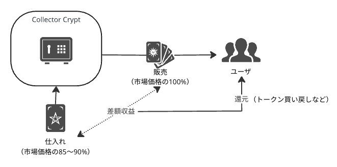 - 仕入れ:市場価格の85~90%でカードを買い取り、Collector Cryptの金庫(保管庫)に保管