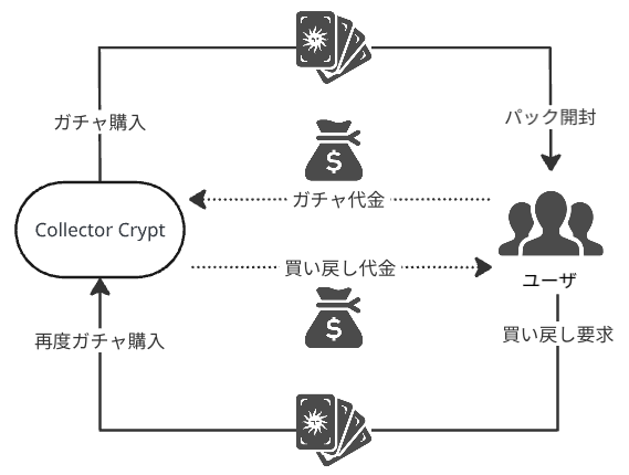 A: 開封したばかりのNFTを85%の価格でCollector Cryptoが買い戻す機能です。ガチャ購入→開封→買い戻し→再購入のサイクルを促進し、9月には1時間で150万ドル相当のパックを売り上げました。