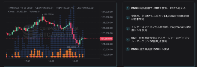 仮想通貨ビットコイン(BTC)は7〜8日にかけて、史上最高値付近まで上昇したのち急落するという激しい値動きを見せた。最高値圏では流動性が極めて薄く、ボラティリティが急拡大しやすい局面にある。7日夜の急落の要因のひとつとして、約6,000億円(32,322BTC)のオンチェーン移動が確認されたが、この一連の動きは上昇局面で過去にも見られた典型的な動きである。