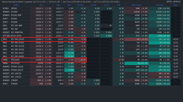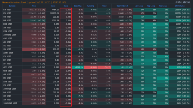 暗号資産全体を俯瞰すると、多くの銘柄で現物価格が先物価格を下回っており、いわゆる「売られすぎ」の状態が継続している点も注目される。