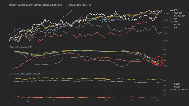過去2カ月の主要アセットクラスとの相関分析によれば、Nasdaq100が−0.16、金(ゴールド)が−0.10、原油(オイル)が−0.17と、いずれも低い相関値を示している。つまり、現在のビットコインは主要アセットクラスとの連動性が極めて薄く、独立した値動きをしていることが確認できる(下画像赤枠)。