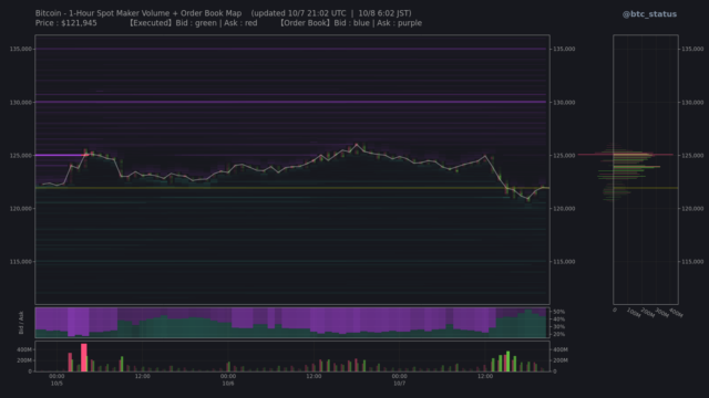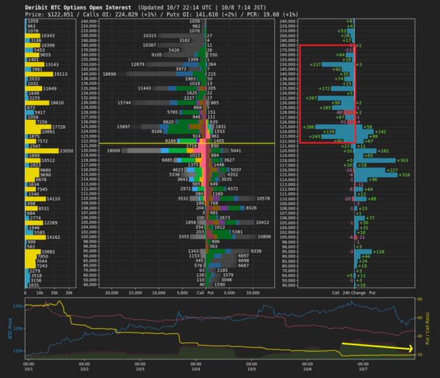 オプション市場では、史上最高値である12万4,000ドルを上回る価格帯でのコールポジションが引き続き増加している(下画像赤枠)。一方で、プット・コールレシオ(PCR)は極めて低い水準にあり(下画像黄矢印)、投資家心理が強気に大きく傾いていることが鮮明である。オプション市場の構造からも、投資家がさらなる上昇を見込んでいる姿勢が読み取れる。
